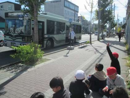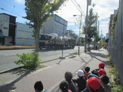 次の国語の単元は「じどう車くらべ」です。今日は学校の周りの道を走っている自動車を見に行きました。学校を出てすぐ,工事現場でクレーン車を見ました。教科書の中にも出てくる車なので,子どもたちも興奮気味でした。東大路通りでは,バスやトラック,キャリアカーなどを見ました。乗用車以外にもたくさんの車が走っていることが分かりました。