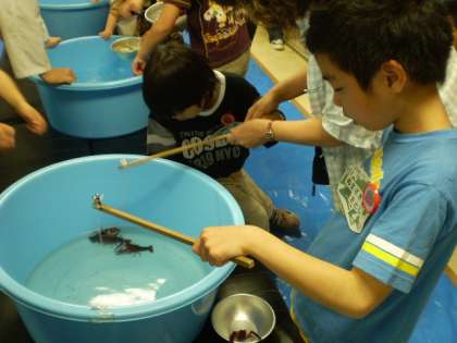 今日は、育成学級の科学センター学習に同行した。上手にふなを捕まえたり、ざりがにをつりあげたりと楽しく過ごした。他校の育成学級の友達ともあいさつをかわしていっしょに遊んだ。プラネタリュムは少しこわかったけど身近な自然をいっしょに楽しみました。