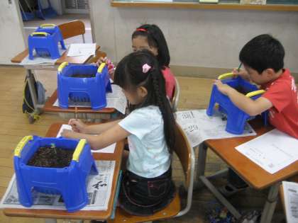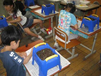 生活科で育てている野菜の観察をしました。「キュウリ・オクラ・トマト・エダマメ」をまきました。まだ発芽していない種もありますが,今の土の様子とどんな野菜に育ってほしいか絵を描きました。中にはものさしの学習で習ったcmを使って,スケッチしている子どももいました。大きく成長してくれることが楽しみです。