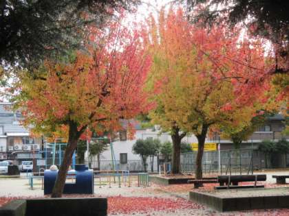 学校の向かいにある飛鳥井公園の木が,大変美しく色づいています。例年なら11月下旬頃に色づくことが多いように思うのですが,9月の涼しさもあってか,今年は紅葉が早いようです。