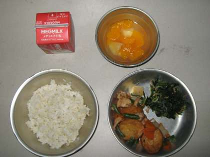 平天とこんにゃくの煮付け・ほうれん草とじゃこのいためものともごはんによくあう献立でした。フルーツ寒天は,1年生は初めてのデザートで楽しんで食べていました。