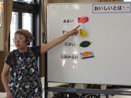 今日の給食はランチルームで食べました。ランチルームでは,栄養教諭の伊藤先生に『おいしいとは・・』についてお話をしていただきました。食べ物には「あじ・におい・いろ・おと」からおいしいと感じられることを学びました。