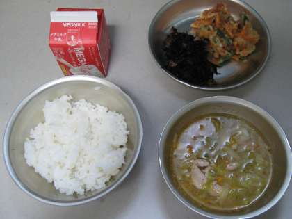 今日の給食は,ごはん・牛乳・かきあげ・ひじきの煮つけ・キャベツの吉野汁でした。