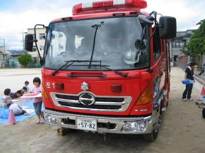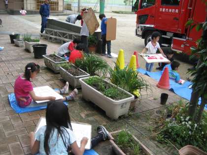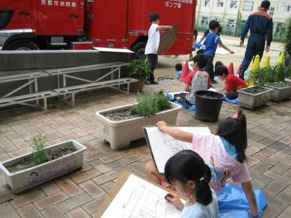 ひなんくんれんがありました。2年生は「おはしもて」をあい言葉に,落着いて訓練に参加をすることができました。訓練が終わってからの振り返りでは,消防士さんがされたお話「一人が走ってころんでしまうと,みんながころんでしまい,逃げ遅れてしまう。」が心に残ったと発表をしていました。その後,しょうぼう自動車をコンテをつかってえがきました。