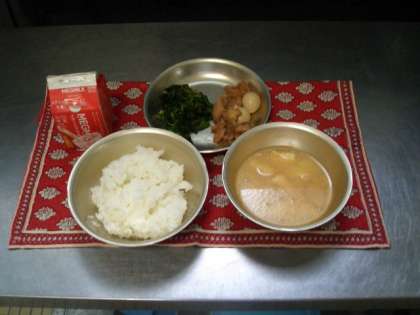 今日は,鶏肉のさっぱり煮でした。しょうがやにんにくがきいて,米酢も入りごはんのすすむ味でした。ほうれん草のおかか煮もあっさりとしていて,よく食べていました。