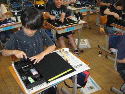 「あ、墨のいいにおいがしてきた!」「うぁ、真っ黒の墨になってきた。」と,とってもうれしそうです。
