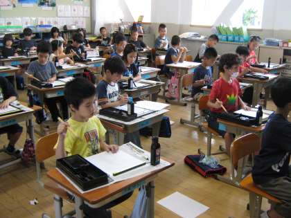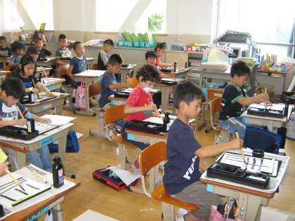 習字の学習をしました。道具の名前や,置き方,筆の持ち方,姿勢を確認してから,まずは墨をすりました。