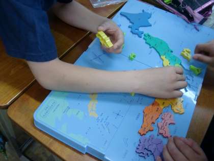 社会科では,日本の47都道府県の学習において,地図パズルを使って楽しく学習しています。
