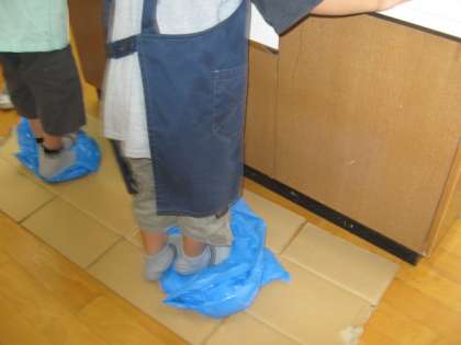 日曜参観日にうどんを作りました。粉に塩水を混ぜて作りました。手でこねて,足でふんでこしのあるおいしいうどんができました。