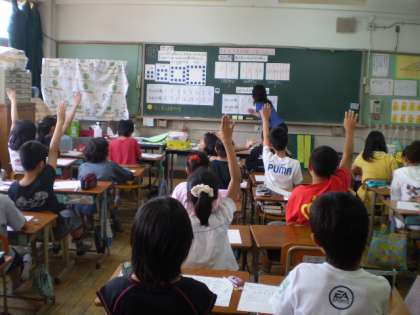 5年の算数科で「変わり方のきまり」という単元で授業を公開しました。ホップで今まで学習した「変わり方のきまり」の問題を、表にあらわしてそのきまりを使えばよいことを確かめました。そしてステップ1で紙を折った回数とできた長方形の数を調べました。学んだことを生活に活かす学習といえます。実際に折れない回数も表で調べるとわかり、表を使うよさに気づくことができました。