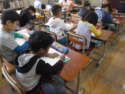 大きな返事をする練習をしてから,早速書写の授業です。お手本の字を見ながら,自分の名前を丁寧に書けました。みんな満足した様子でした。
