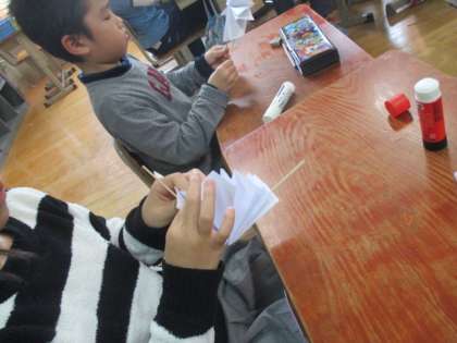 「算数の時間に,紙を使って何を作るのかな?」と不思議そうでしたが,折った紙をのりでつけていくと…角の大きさを表すグッズの出来上がり!自分で作った学習道具で楽しく角の大きさの勉強をしました。