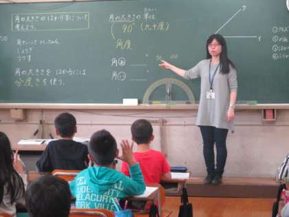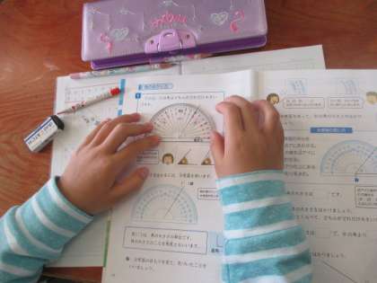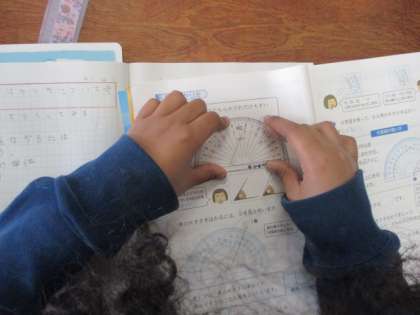 「角の大きさ」という新しい概念を身に付けた子どもたち。次は,角の大きさを比べてみました。「う〜ん。大体アの方が広いと思うけど…」そんなときに使うと便利なものは分度器です。分度器を使って実際に角の大きさをはかってみました。