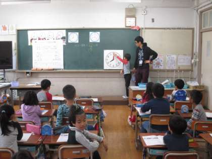 算数では,時間について学習しています。「時刻は,何時かな。」「どれだけの時間がかかったかな。」などの問題を自力で考えて答えています。発表では,みんなの前に出て,聞こえる声で発表できました。これからも,自信をもって発表してほしいと思います。