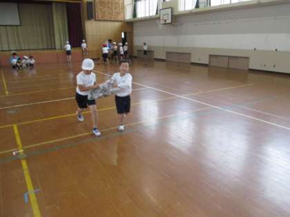 今日の体育はリレー遊びのはずだったのですが、残念ながら雨のため、体ほぐしの運動でした。今日の活動は、「風船を上手に使って」です。輪になって風船を落とさないようにする活動や風船を新聞紙を使って上手に運ぶ活動をしました。