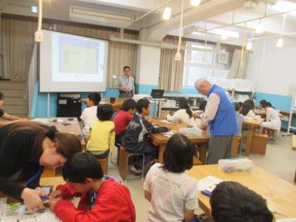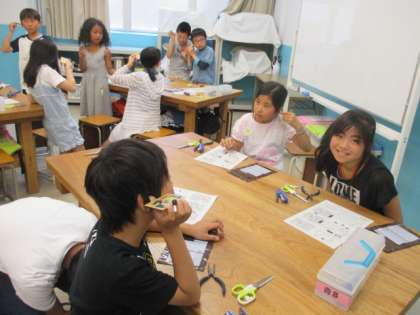 企業のブースで展示を見て学習した後は,実際にモノづくりの一部分を体験しました。今日はオルゴールを作りました。一般的なパソコンの中には,世界の人口と同じくらいのコンデンサなどの電子部品が入っていることを知って,子どもたちはとても驚いていました。