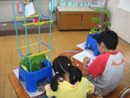せいかつかでそだてているやさい『エダマメ・キュウリ・ミニトマト・オクラ』のかんさつをしました。かんさつのやくそくとして,目で見る・鼻でにおう・手でさわってわかったことをノートにかきこみました。「はにけがはえていたよ」「いいにおいがした」「きいろい花がさいた」とはっけんをしていました。
