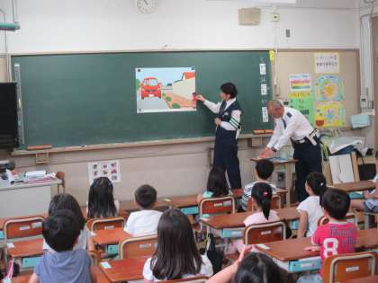 低学年を対象にした交通安全教室を行いました。例年,下鴨警察署・地域の交通安全会・PTAの方々にお世話になり,安全な道の歩き方を学習しています。