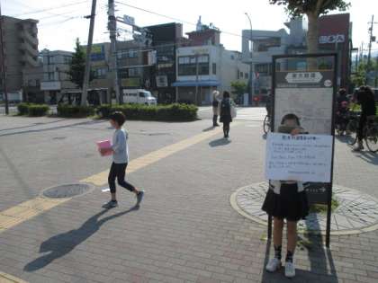 3日間,百万遍と出町柳駅前で熊本地震の募金活動をしています。校門前で募金をしたあと,子どもたちから人がもっと通る場所でしたいという意見が出ました。子どもたちの「募金お願いします。」という心のこもった言葉が多くの人に伝わり,たくさんの募金が集まっています。30日(月)が最後になります。子どもたちのがんばりが熊本や大分に届くことを祈っています。