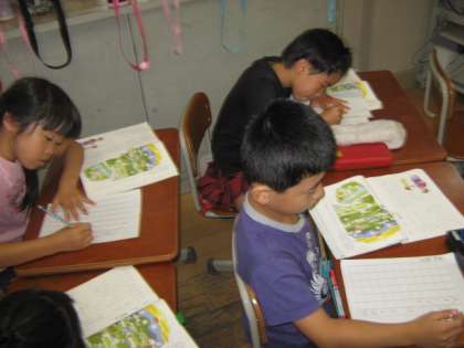 1年生でならったかんじの「犬・町・山・川・森」などをつかって,犬といっしょにさんぽをするお話を作りました。「犬の ころは,さんぽが 大すきです。」など,いろいろなお話作りを楽しみました。