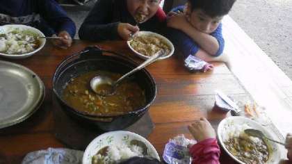 おいしそうにカレーが出来上がり,満足そうな子どもたち。いただきますをして食べました。「おいしい!」と声が上がります。自分たちで作ったカレーの味は,最高だったことでしょう。笑顔がいっぱいこぼれていました。
