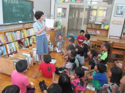 「虫」の本を紹介してもらいました。虫の図鑑だけでなく,虫の写真やお話の本がたくさんあることを知りました。虫のきらいな子も,驚きながらしっかりと聞いていました。 いろいろな種類の本を読んで,自分の興味の幅を広げていってほしいです。