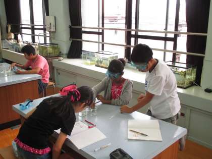 理科の学習です。7種類の水溶液を酸性・中性・アルカリ性に分けました。危険な水溶液もあるので,ゴーグル着用です。なんだかみんな研究者みたいでした。