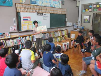 読み聞かせをしてもらいました。今日は、運動会でのお話でした。良いことをすればだれかが見ていることが分かる絵本でした。みんな真剣に聞くことができました。これからもたくさん本に親しんでほしいと思います。