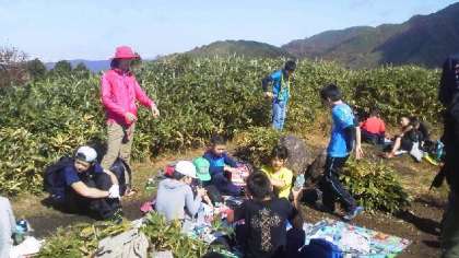 目標地点に全員で到着できました。途中,険しい道やこわい崖もありましたが,みんな頑張りました。達成感いっぱいの子どもたちです。美味しそうに,おにぎりを食べてます。山登りをして食べるおにぎりの味は格別です。