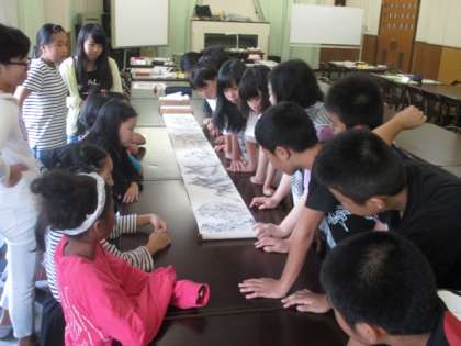 地域に住んでおられる大学の先生でぶっくままクラブでもお世話になっている先生に来ていただき,絵巻物について教えていただきました。絵巻物は,全部広げて見るものでなく,少しずつ広げて読んでいくことが大切だと教えていただきました。実際に江戸時代に作られた絵巻物を見せていただき,楽しさを味わうことができました。