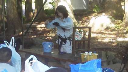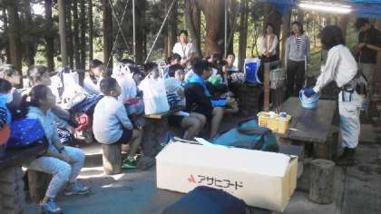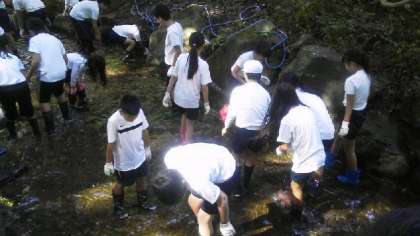 今日のメインの活動,魚つかみです。素早く逃げる魚を捕まえるのに苦戦した子もいましたが、最後には全員が魚を捕まえることができました。自分が捕まえた魚を調理するのも野外ならではの活動です。魚をさばくのも、嫌がったり怖がったりせず、魚の命をいただくことに感謝しながら、美味しくいただきました。