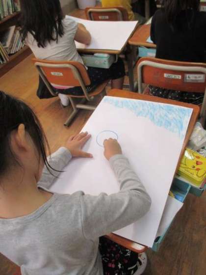 図工の時間にくじらぐもの絵を描いています。まず最初に,雲と青空を表現するためにパフを上手に使いました。その次は,雲の上で遊ぶ子ども達です。楽しい様子を表すためにどんな風に描けばいいのかよく考え描いていました。