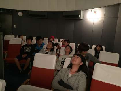 本日最後の活動の天体観望会とプラネタリウムです。大きな望遠鏡で星の観察をしていると,曇っていた空がだんだん晴れていき,たくさんの星を見ることができました。京都ではなかなかここまで星を見ることができないと思います。その後,プラネタリウムで星座のことを教えてもらいました。今夜は星の世界に思いを馳せる一夜になることでしょう。