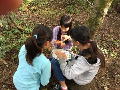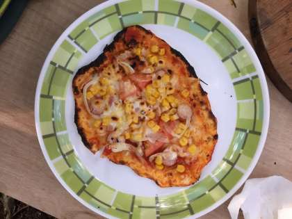 森にある窯で,手作りのビザを焼きました。生地を広げ,ピザソースを塗り,好きな具をトッピングしました。