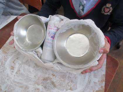 先週,液体粘土をタオルにしみこませました。一週間たち型からそーっと外すと,粘土を含んだタオルが自分の思った通りにかたまりました。これから絵の具で色をぬっていきます。