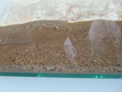 理科の学習です。地層はどのようにできるのか実験しました。運動場の土をつかって,水を流すと,見事に層ができました。れき,砂,ねんどの層です。地層がどうやってできるのか,確認することができました。ある子がポツリ。「ミルフィーユみたいや。」