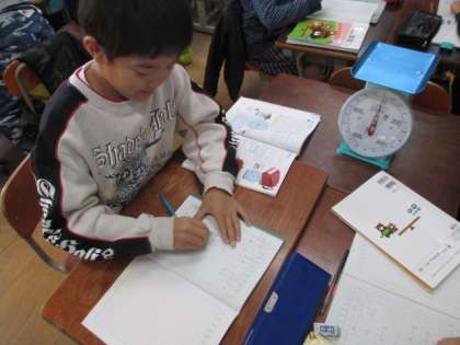 理科と同じく,算数でも「重さ」の単元を学習しています。今日は「はかり」を使って物の重さを量る活動をしました。調べたことを意欲的に発表しようとする姿が見られました。