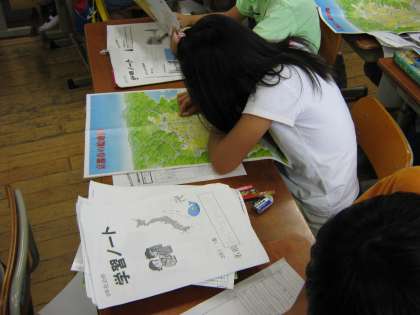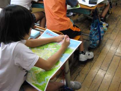 「山の中にあるね。」「何で行くのかな。」「どれくらいかかるのかな。」と楽しんで地図を見ていました。