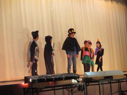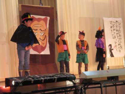 春から学習教材として扱ってきた「かいけつゾロリ」シリーズを劇にしました。子どもたちの大好きなシリーズで,お話の内容をよく分かっていることもあって,それぞれの役をしっかりと演じ,見ている側にもストーリーがよく分かる劇に仕上がっていました。道具作りから関わってくれた6年生が,演技や歌で劇をさらに盛り上げてくれました。