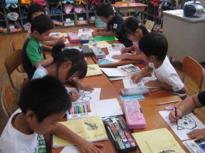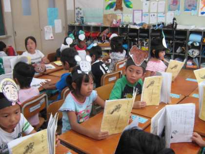 国語の学習で,「大きなかぶ」を読んでいます。「うんとこしょ,どっこいしょ」とみんなで声を合わせて上手に読めました。今度は,3つのグループに分かれて劇をします。グループごとに役割を決めるための話し合いをしました。役割が決まると,それぞれの役のお面を作りました。劇に向けて,張り切って練習をしていきます。