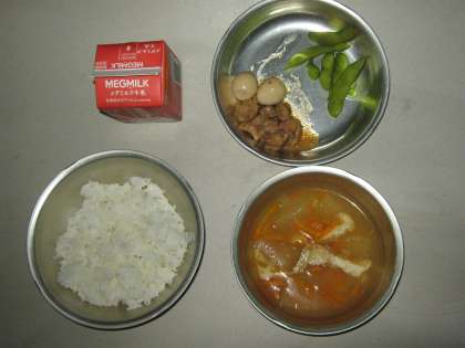 今日の給食は,ごはん・牛乳・鶏肉のさっぱり煮・えだ豆・とうがんのくずひきでした。鶏肉のさっぱり煮は,しょうがやにんにくが入り,香りもよく味もごはんによくあって好評でした。えだ豆も喜んで食べていました。