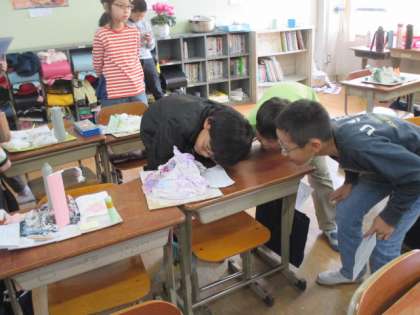 岡本太郎氏の「芸術は爆発だ!」のようなスタートだった液体粘土の作品作り。固まった形を生かして,一人一人が楽しい自分だけのワールドを作りました。乾いた粘土に絵の具で色を付け,飾りをつけていくと素敵な作品に仕上がりました。今日は自分のワールドの説明を発表し,友だちの作品を鑑賞しました。お互いの良いところを交流し,次回の作品作りへ生かそうとしていました。