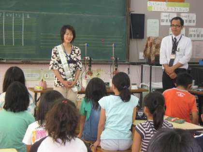 気象予報士の方とSHARPの方に講師に来ていただきました。気象予報士さんには, 地球の温度が上がる原因を分かりやすく教えていただきました。このまま,温暖化が進むと,今世紀末には,世界の気温が最大で6.4度上がってしまうそうです。これを防ぐためには,1人ひとりの小さな努力が欠かせないそうです。