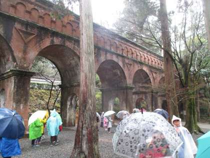 お弁当を食べた後は,インクラインや南禅寺の水路閣を見に行きました。雨が降る中だったので歩くだけでも大変でしたが,熱心にメモを取っている子もいました。水路閣では,みさきの家で交流した養徳小学校の4年生と再会しました。