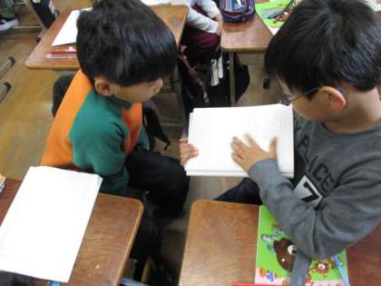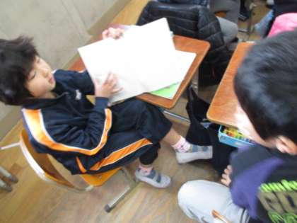 分数のひき算の学習をしました。今日は,たし算の学習をもとにして,ひき算の解き方を考えました。図にかいた考えをもとにとなりの席の子に話していました。ノートを見せて伝え合う姿も見られました。
