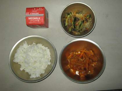 今日の給食は,ごはん・牛乳・たらのピリカラいため・チャプチェでした。