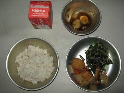 今日の給食は,麦ごはん・牛乳・平天とこんにゃくの煮つけ・ほうれん草とじゃこのいためもの・みたらしだんごでした。平天は甘辛い味でごはんにもよく合い,子どもたちに人気があります。