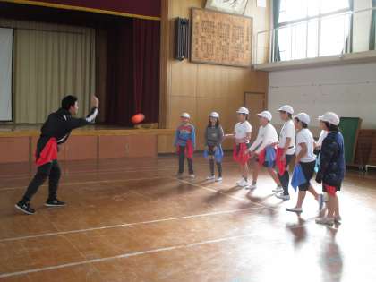 今日から体育の時間にフラッグフットの学習が始まりました。京都大学のアメリカンフットボール部の学生が教えに来てくれます。3年生の時にも教えてもらっていたので顔を覚えていたお兄さん・お姉さんもいたようで,とても喜んでいました。最初はフラッグを腰につけ,しっぽとりをしました。その後,ボールを投げたり,受けたりしてパス練習をしました。