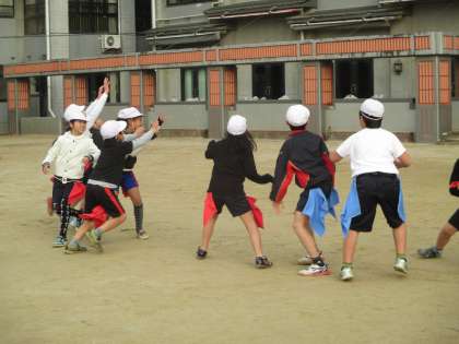 2回目のフラッグフットの学習でした。最初はボール慣れでしたが,2回目ということで,みんなどのように動くと良いかをしっかりと考えて練習していました。今回はいくつかの作戦をゲームの中で使っていけるように準備しました。試合が始まると,自分の役割を意識しながら点を入れようとチームで協力し合っていました。