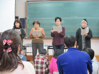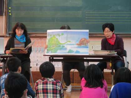 子どもたちの大好きな「恐竜」と今年の干支にちなんで「とり」が主人公の絵本や詩を紹介していただきました。子どもたちはもちろん,一緒に参加してくださったお父さんやお母さん,そして先生たちもお話の世界に入り込んでいました。